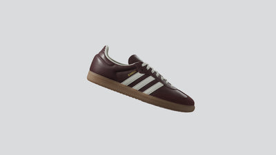 אדידס סניקרס SAMBA לנשים, בצבע בורדו עם פסי המותג האייקונים בצבע לבן, בעיצוב אלגנטי ונקי מעור רך, עם בטנה מעור סינטטי וסוליית גומי בצבע חום, בסגירת שרוכים בצבע לבן.