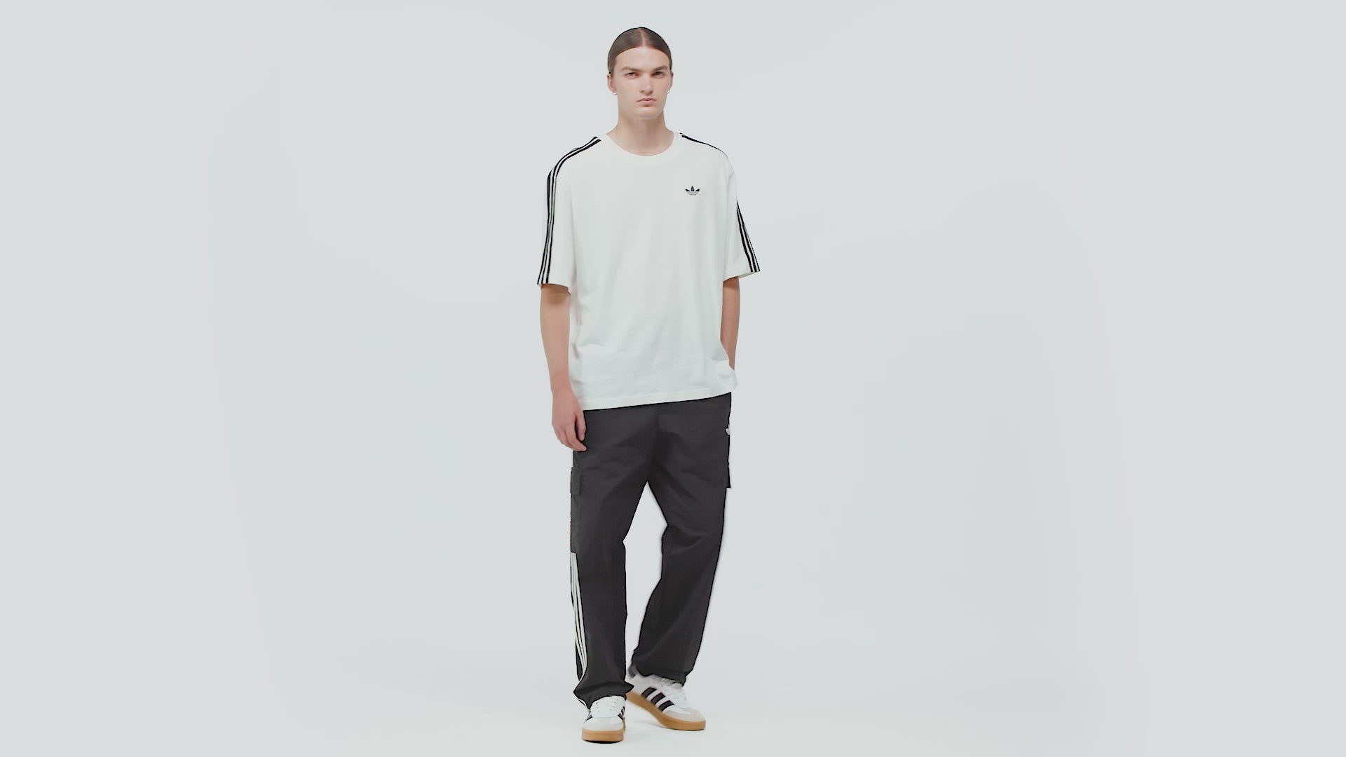 אדידס טישרט ADICOLOR 3-STRIPES לגברים, בצבע לבן עשויה 100% כותנה, בגזרה אוברסייז עם שרוולים קצרים וצווארון עגול, בשילוב לוגו ופסי המותג בצבע שחור בחלקה הקדמי.
